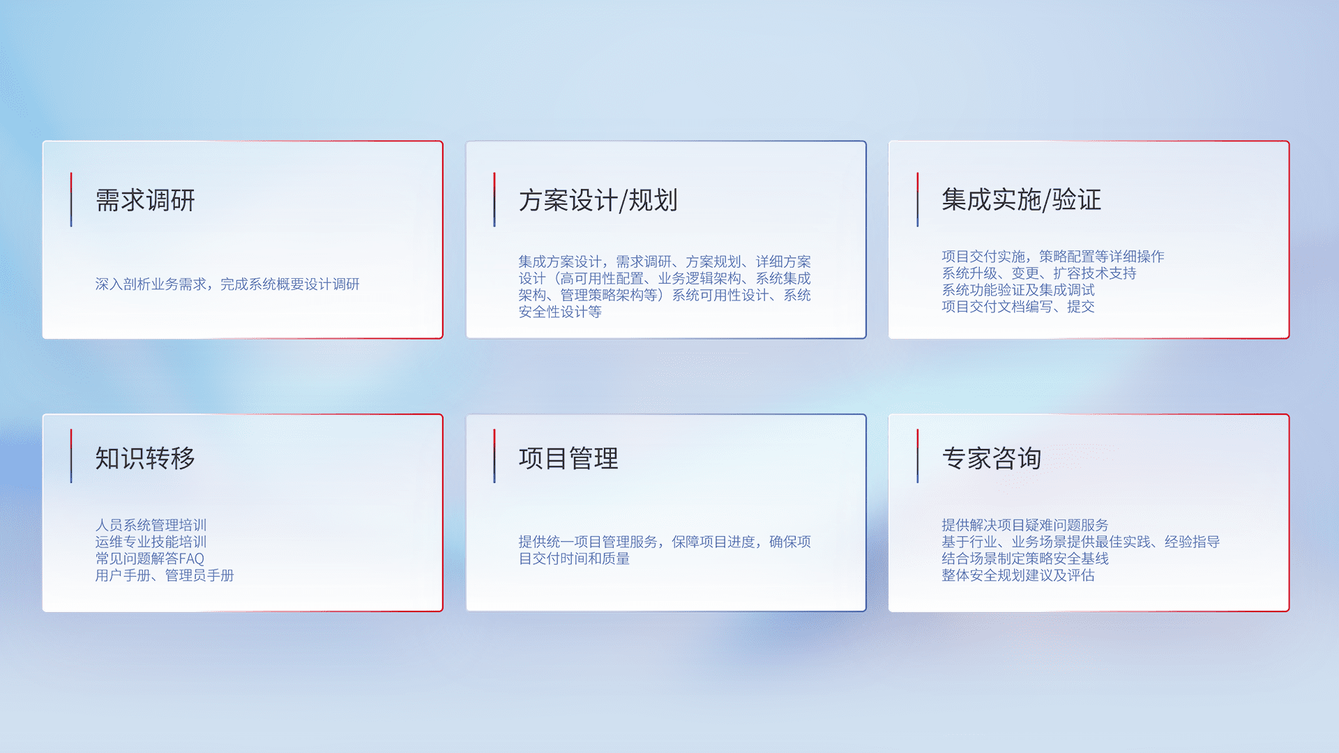 针对客户行业特性,,,,将宏观的安全战略和需求,,,,通过专业的交付服务,,实现项目落地,,,,为客户提供标准规范的集成交付服务。。。